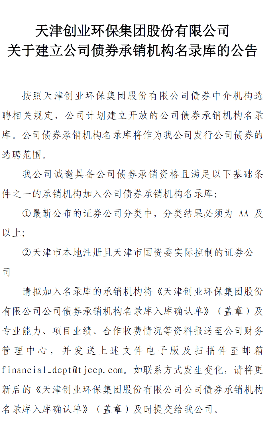 天津創業環保集團股份有限公司關于建立公司債券承銷機構名錄庫的...