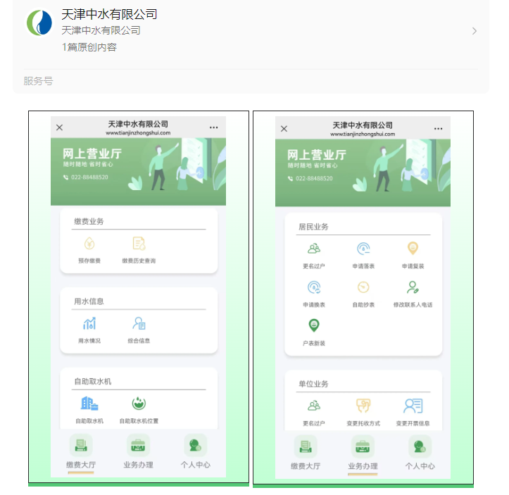 再生水網上營業廳依托“天津中水有限公司微信公眾號”平臺,“繳費大廳、業務辦理、個人中心”三大板塊,從用戶角度出發,充分考慮體驗感、服務性及透明度,為用戶提供更加便捷、高效的服務新體驗:居民用戶和單位用戶可通過繳費大廳功能隨時隨地查詢水費賬單,通過多種支付方式進行在線繳納,無需到線下營業廳繳費;業務辦理提供報裝申請、更名過戶、信息變更、水表更換、落表及復裝等多種自助功能,只需在線提交相關信息和照片,即可完成業務辦理,極大節省了用戶時間和精力;通過個人中心實時更新的數據,用戶可以查詢用水歷史記錄、用水曲線圖等信息,更合理地規劃用水。網上營業廳打破了傳統營業廳時間和空間的限制,以數字化賦能自助化,助力用戶滿意度和信任感的提升。