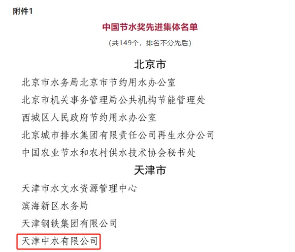 中國節水獎由國家水利部主辦,是為深入學習領會“節水優先、空間均衡、系統治理、兩手發力”治水思路,表彰在農業節水增效、工業節水減排、城鎮節水降損等方面作出突出成績的集體和個人而設立的獎項,旨在凝聚全社會共識和力量,激勵社會各界積極投身節水實踐,攜手推進節水工作,加快建設節水型社會,是我國節水領域的最高榮譽。中水公司在兩級集團的支持下,積極參與評選,經天津市水務局推薦、征求意見,現場考察以及兩輪專家評審、公示等程序,最終成功獲評。